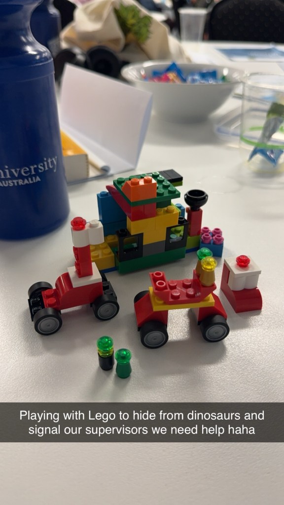 With approximately 35 students in attendance, the workshops over the 5 days were fantastic. They ranged from time management with the amazing Maria Gardiner at Thinkwell to proposal feedback via speed dating to ethics processes…all the way to public speaking and pitches! Dr Cait Wilson’s session on conference presentations was also a highlight. There were lots of wonderful sessions that were just SO RELEVANT for pre confirmation of candidature students. I wish I had seen them last year – particularly the methodology and lit review info. Very useful for all candidates at all stages. On the last day we built Lego dinosaur defences and used a “grumpy balloon” to give feedback to each other.