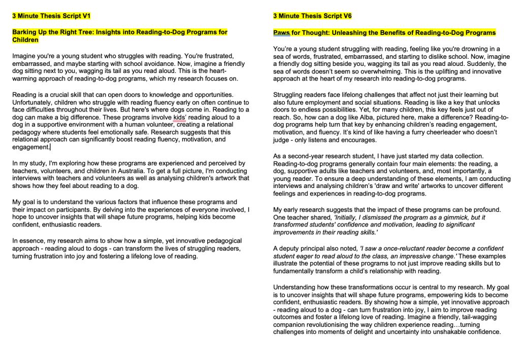 • The Importance of Visuals: VYT allows flexibility (video, images, slides). One of the very early pieces of VYT feedback I got was on a slide where I say “now imagine that dog wagging its tail as the child reads aloud….” and to use a video of a kid reading to a dog while the tail wags. Cue 4hrs of attempting to film that! For 3MT, I will use a single evocative image—think minimalist.