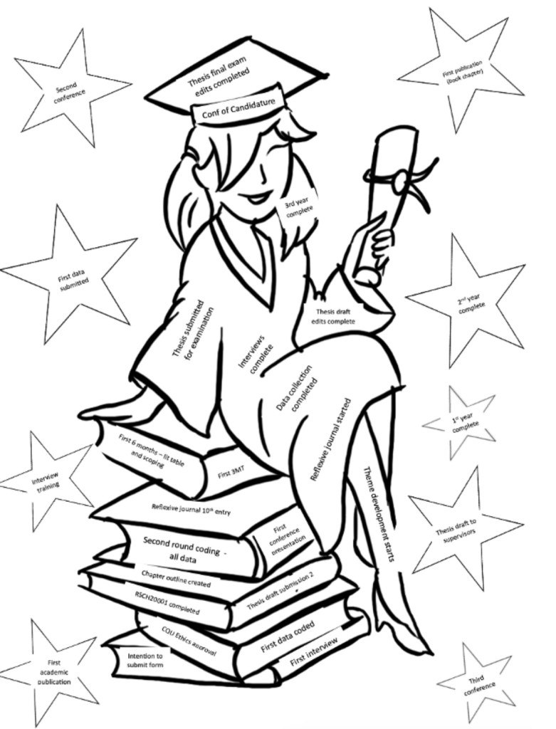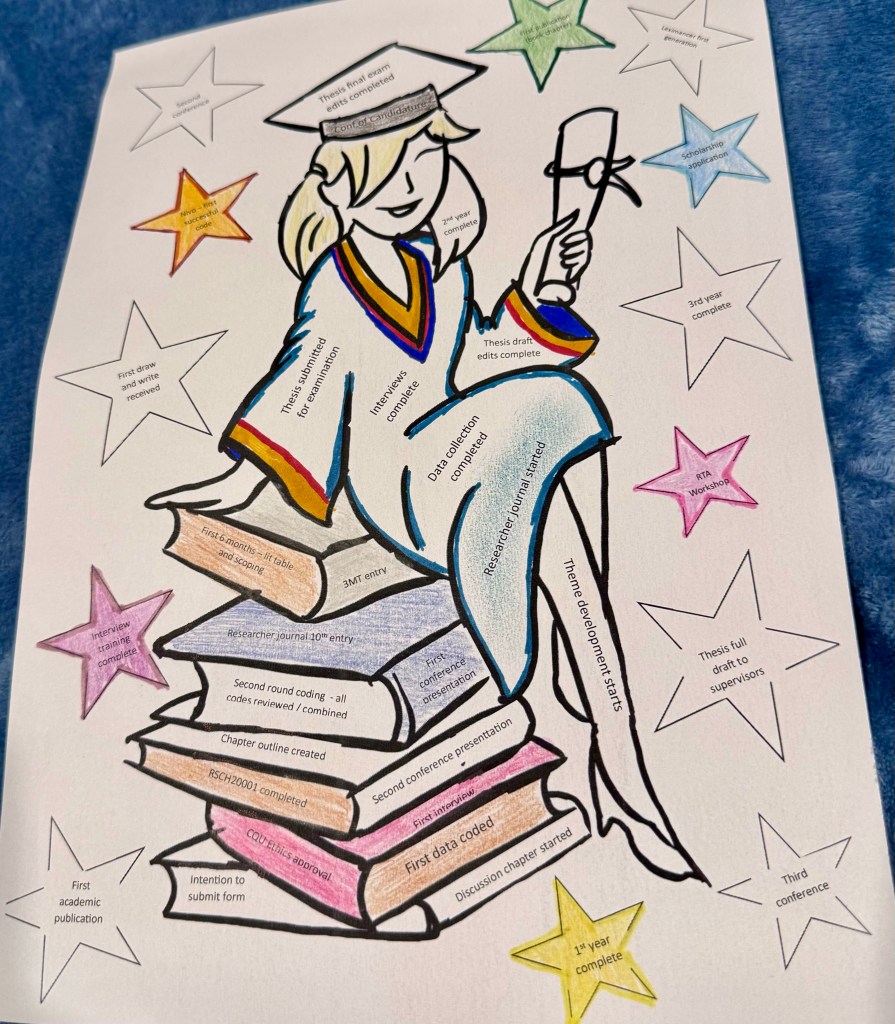 I wanted to share something I’ve found super helpful on my doctorate journey – I created my very own personalised “colour-as-you-go” progress tracker. It’s nothing fancy, just a fun way to keep track of all the big milestones, like submitting my thesis draft, presenting at conferences, or hitting those smaller steps, like coding data for the first time!