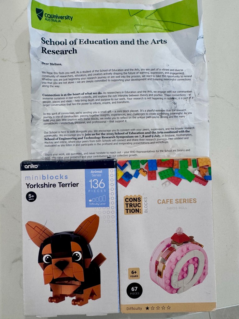 As an external doctoral student with CQUniversity’s School of Education and the Arts, I don’t always feel the buzz of campus life. But this week, that changed. I opened my mailbox to find a crinkled (but heartfelt!) letter from the research team – and two tiny, delightful surprises: a Yorkshire Terrier mini-block set and a snack based mini-block construction kit.